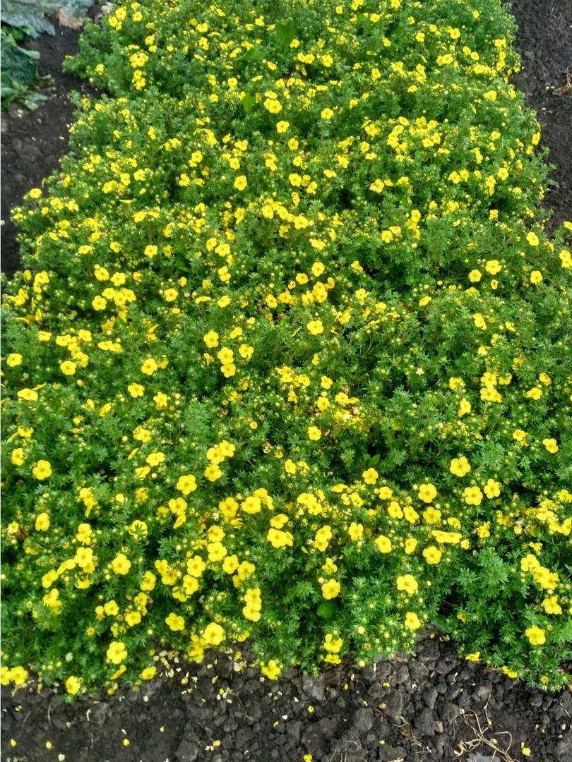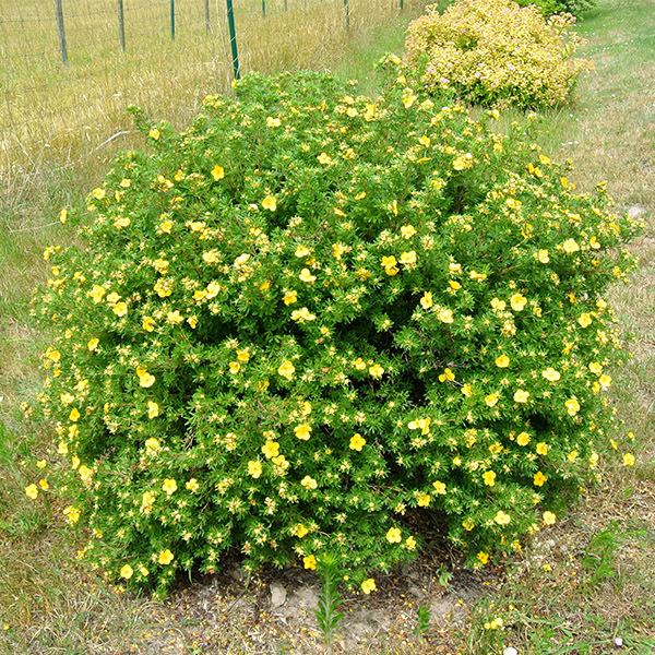 Это невысокий кустарник с цветками ярко-желтого цвета, в высоту 20-60 см. Листья — перыстые, покрыты мягким ворсом. Цветет лапчатка с июня по сентябрь, цветки одиночные, до 3 см. в диаметре, в сердцевине — множество тычинок. Лапчатку широко используют в ландшафтном дизайне и озеленении садовых участков. Ее сажают одиночно либо в бордюры, живые изгороди, альпинарии. Довольно часто лапчатка служит в качестве переднего плана для более высоких кустарников. Лапчатка также хороша в каменистых садиках среди камней и небольших композициях. Лапчатка морозоустойчива, хорошо переносит засуху, но любит влажный воздух, светолюбива. Молодые растения растут быстро, но по мере старения, интенсивность роста падает. Наряду с отличными декоративными качествами лапчатка желтая обладает целебными свойствами и ее широко используют в народной медицине.