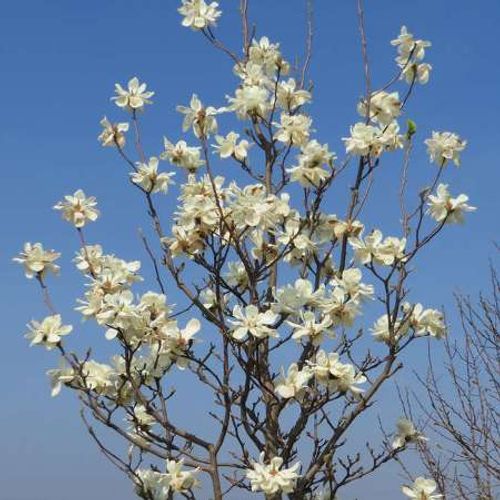 Высота 4-5м, Цветет раньше распускания листьев махровыми белыми цветками. Лимонный аромат. Крона овальная.