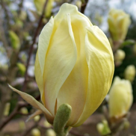 Желтоцветковая магнолия.Вертикально растущий разветвленный кустарник высотой 3,5-5м. Обильно цветет в апреле-мае сливочно-желтыми ароматными цветками.