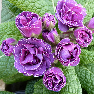 Цветки розовидные, крупные, махровые, фиолетово-лилового цвета с тонким белым кантом, листья плотные, фактурные. Н-10--15см