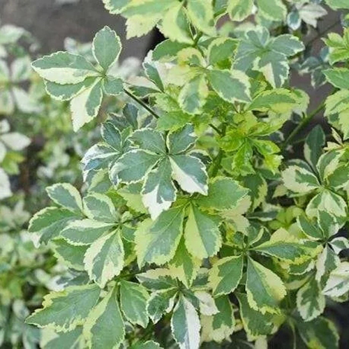 Пестролистный кустарник для тенистых мест. Побеги прямые, с мелкими острыми шипами. Листья зелёные с кремово-белым или мраморным краем, пальчато-сложные. Цветки мелкие, зеленовато-белые, цветёт в мае.
