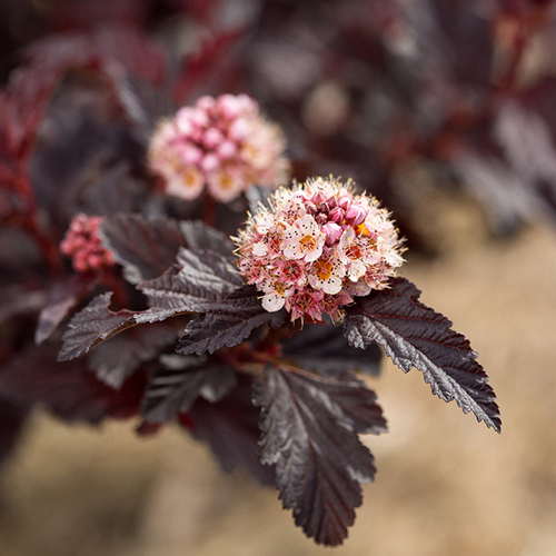 Декоративный, быстрорастущий кустарник с компактной, плотной кроной, высотой и диаметром до 2 м. Листья глубоко надрезанные, при распускании медно-оранжевые или оранжево-красные, затем постепенно темнеют, становясь пурпурными. Цветки небольшие беловато-розовые, собраны в щитки и красиво расположены вдоль побегов. Цветет обильно и продолжительно с мая по июль.
