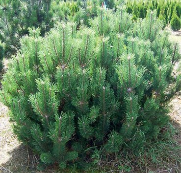 Кустарниковая форма густой сосны. Распростертая стелющаяся крона. Хвоя темно-зеленого цвета, длиной около 4 см, собрана по две хвоинки, игольчатая, иногда перекрученная, жесткая.