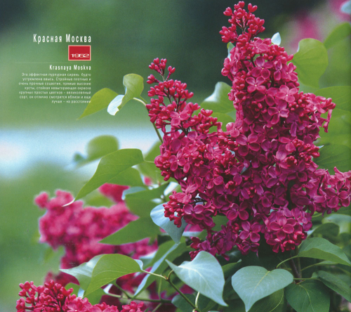 Россия, 1952,Колесников Эта монументальная пурпурно-красная сирень будто устремлена ввысь. Стройные, плотные и очень прочные соцветия, прямые высокие кусты, невыгорающая окраска крупных простых ароматных цветков - великолепный сорт, он отлично смотрится вблизи и ещё лучше - на расстоянии. Цветёт обильно в средние сроки. Отличается стойкой окраской цветков, а её оттенок уникален и характерен только для этого сорта. Очень эффектен в озеленении. Этим сортом Л.А.Колесников, наверное, выразил огромную, искреннюю любовь к родному городу Москве, где он родился и прожил всю жизнь, создавая неповторимую красоту в облике сво-их замечательных сиреней! И по авторитетному мнению международных экспертов он входит в топ-список лучших сортов Мировой коллекции, принадлежащих к пурпурным сиреням VII группы!