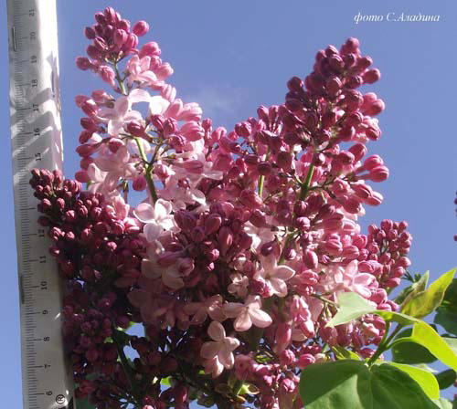 Сеянец от свободного опыления сорта Гортензия; авторы: Аладин С.А., Архангельский В.Н., Полякова Т.В., Аладина О.Н. 2011 год. Кустарник среднего размера, раскидистый, средней густоты. Листья средние, сердцевидные, матовые, волнистые, светло-зеленые, молодые с антоциановым оттенком. Побеги оливково-зеленого цвета, длина цветоносных 30-35 см. Цветоносы прочные. Соцветия крупные, размером 22-25 х 20-23 см, состоят из 3-5 пар широкопирамидальных метелок, плотные. Среднее количество цветков в соцветиях 1100-1550 шт. Бутоны темно-розовые с шоколадным оттенком, иногда зеленоватые на вершине. Цветки крупные, диаметром 2,7-3,0 см, немахровые, нежно-розовые с палевым оттенком (отгибы венчика более светлые по краям), с нижней стороны с жемчужным отливом. Отгибы венчика обратнояйцевидной формы с округлым кончиком. Окраска цветков не выгорает. Аромат сильный. Цветение обильное, с 9-14 мая, массовое - 15-29 мая, продолжительное.