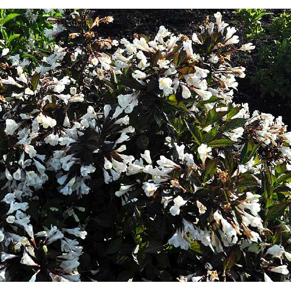 Компактный кустарник, контрастный: листья темно-коричневые, постепенно приобретают фиолетовый отенок, цветки- белые колокольчики.Цветет в мае-июне