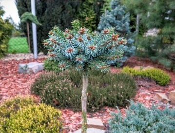 Сферическая формы карлик с сильными побегами и серебристо-серой хвоей.