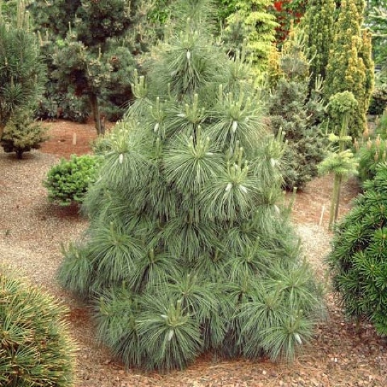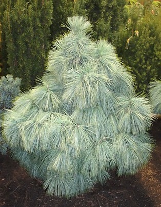 Карликовая сосна симметричной пирамидальной формы, густая. Растёт медленно, к 10-ти годам высота 80 см, ширина 50 см. Компактная, обрезки не требует. Хвоя красивая, пушистая, всегда свисающая, длиной 10-12 см, от серебристо-голубой до голубовато-зелёной. Место солнечное. Почва влажная дренированная. Зона 3 (до -34ºС).