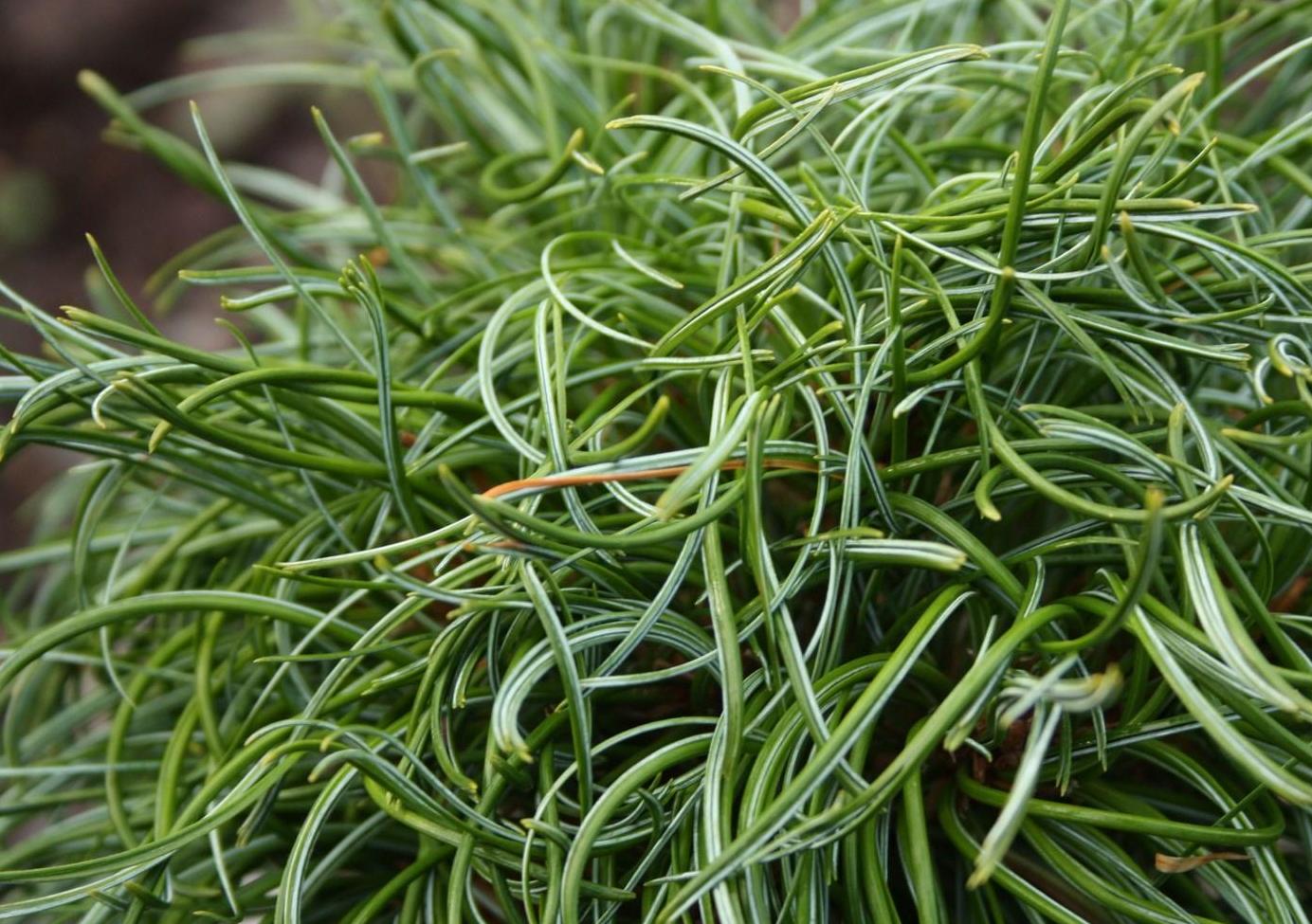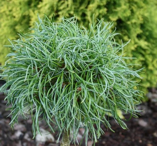 Очаровательный карлик с длинными, сильно скрученными темно-зелено-голубоватыми иглами.