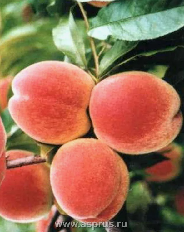 Персик "Вельвет" - среднеспелый сорт с крупными, шаровидными плодами, окрашенными в светло-оранжевый цвет с ярким красным румянцем, занимающим примерно половину поверхности. Мякоть сочная, десертного кисло-сладкого вкуса, частично отделяется от косточки. Плоды крупные, массой до 160 г, шаровидной формы, с легким опушением. Основной цвет плода светло-оранжевый, с ярким красным румянцем, покрывающим примерно половину поверхности. Мякоть сочная, нежная, кисло-сладкая, десертного вкуса. конец августа - начало сентября самоплодный 3-4 1,5-1,8 м