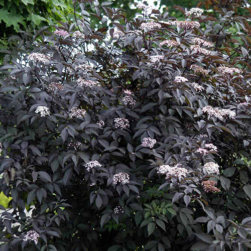 Листопадный кустарник с фиолетовыми побегами. Листья пурпурно-фиолетовые,почти черные,крупные, по краю острозубчатых листочков, при растирании издающих резкий залах, осенью-красные. При выращивании в тени растение остается зеленым в течение всего сезона. Бутоны-розовые, цветки бело-розовые, пахучие, в густых зонтиковидных соцветиях. Продолжительность цветения 25-35 дней.