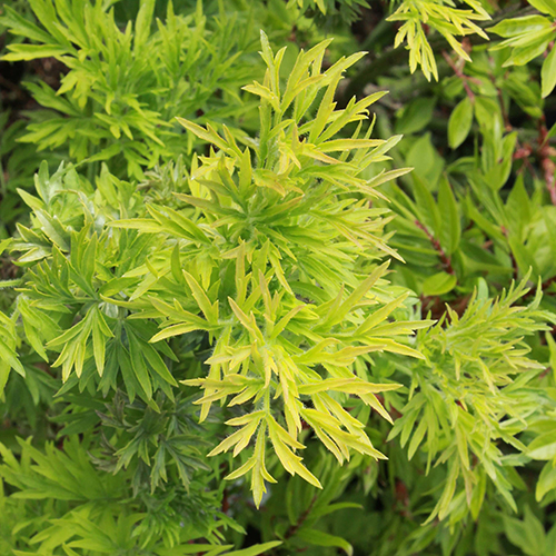 Сорт отличается стройной формой и строго вертикальным ростом побегов. Листопадный кустарник или небольшое деревце высотой 3м и шириной 0.7м. Глубоко-разрезанные, лимонно-желтые листья (в тени зелено-желтые). Цветки белые, пахучие, в густых зонтиковидных соцветиях диаметром до 20 см. Растет быстро.