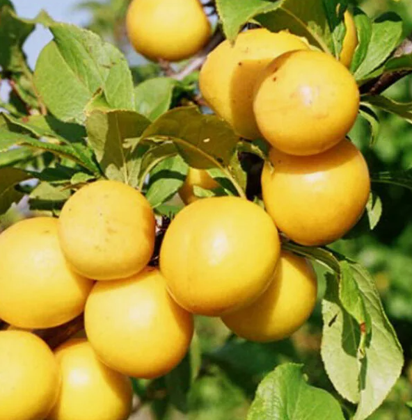 Слива Вика – слаборослое дерево с компактной кроной округлой формы. Штамб слабо выражен. Побеги тонкие, прямые или немного изогнутые, коричнево-желтой окраски, с небольшими чечевичками. Ветви растут под острым углом относительно ствола. Листья темно-зеленые, средних габаритов, шириной 5 см и длиной 11 см. Форма листьев эллиптическая, основание конусообразное, кончик заострен. Лист неровный, внешне напоминает лодочку. Черешки средних размеров. Плод яйцевидной формы, вытянута у вершины. Высота около 40 мм, толщина – 30 мм. Масса 14–15 г. Окраска ярко-желтая, светло-желтая мякоть, волокнистая, средней сочности, косточка мелкая, без труда отделяется от мякоти. август Алтайская Юбилейная, Пересвет, Горянка, Ксения, Пониклая 3 1-1,5 м