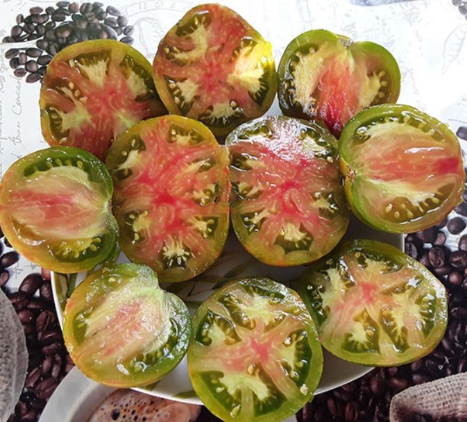 Куст индетерминантный (2-2,5 м), среднеспелый сорт. Сливовидный томат потрясающей расцветки с полосками, нежной мякотью с цветными переливами. Сами плоды для сливок даже крупные, весом до 200 гр. Вкус потрясающий, насыщенный сладкий с тропическими нотками. Урожайность очень высокая. Подойдут для засолки и салатов, хорошо и долго хранятся. Формировка в 2-3 стебля.