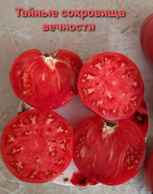 ТАЙНЫЕ СОКРОВИЩА ВЕЧНОСТИ Старинный сорт-реликвия из Италии. Индет. ср.спелый, высокорослый( в теплице высота куста около 1,8 м.) сорт. Лист простой. Плоды малиновые,сердцевидные, вкусные и сладкие, с нежной кожицей, массой 200-500 г. Мякоть сочная, мясистая, ароматная.