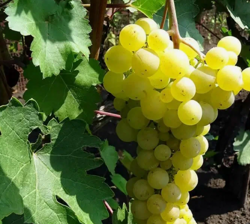 Очень ранний срок созревания, 90-100 дней. Кусты средней силы роста. Цветок функционально женский. Грозди 250-300 гр., цилиндрические, средней плотности. Ягоды- крупные, 4-5 гр, круглые, иногда чуть приплюснутые, янтарно- желтые, содержат 1-2 мелкие семена. Мякоть мясисто - сочная, тающая, вкус - гармоничный, с мускатным ароматом. Устойчивость к милдью, оидиуму и серой гнили высокая. Морозостойкость до - 26°С.