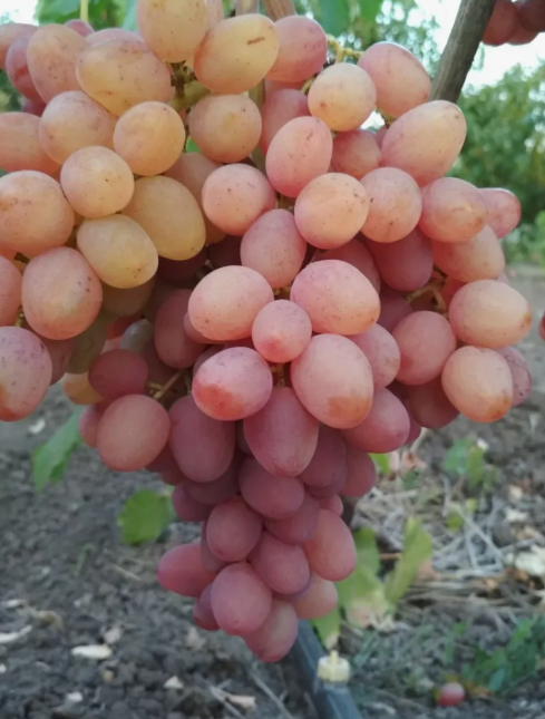Ранний сорт. Срок созревания 115-125 дней. Кусты средней силы роста. Цветок обоеполый. Грозди конические, средней плотности, весом 700-1500 г. Ягода крупная, с равномерным бледно-розовым окрасом. Мякоть плотная, с гармоничным вкусом. Морозостойкость до - 23°С. Устойчивость к грибным болезням повышенная.
