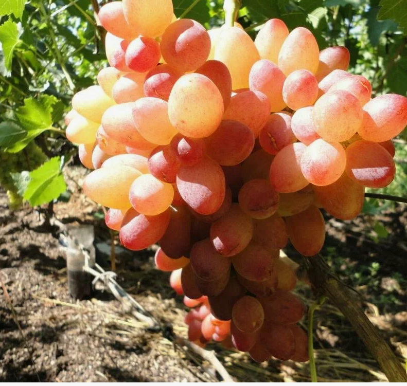 Срок созревания 115-125 дней. Куст большой силы роста, мощный. Грозди крупные, весом больше 0,8-1,5 кг, конической формы. Ягоды слегка вытянутой яйцевидной формы, весом до 15 гр. Ягоды с сочной и нежной мякотью, сладкие на вкус. Послевкусие мускатное, яркое, легко запоминающееся. Тонкая, но плотная кожица с прожилками – еще одно из достоинств. В технической спелости ягоды с нежно-розовым оттенком, так и светятся на солнце. Морозоустойчивость до –21°С. Устойчив ко многим заболеваниям и вредителям.