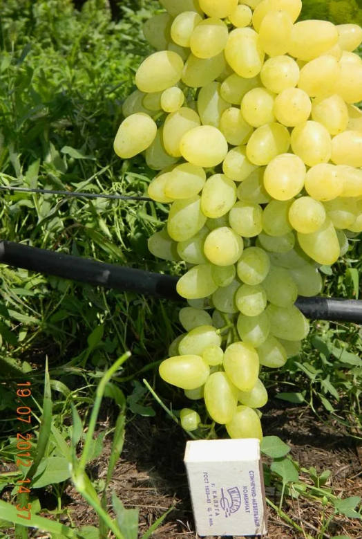 Срок созревания 105-115 дней. Кусты сильнорослые. Грозди крупные, конические, среднеплотные, не подвержены горошению. Ягоды крупные, овальные, желтого цвета. Вкус приятный, с гармоничным сочетанием сахаристости и кислотности. Мякоть плотная. Морозостойкость до -23 °С. Устойчивость к милдью и оидиуму средняя.