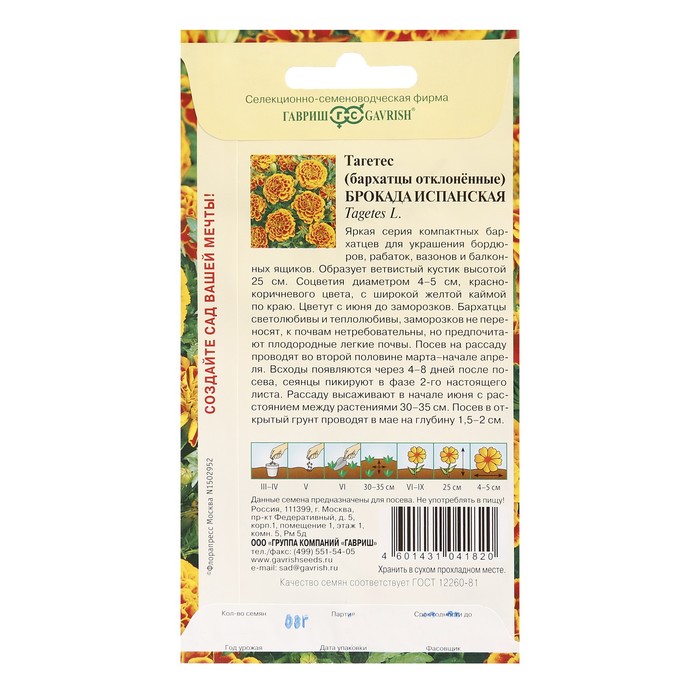 Семена цветов Бархатцы отклоненные (Тагетес) «Брокада испанская», ц/п, 0.3 г