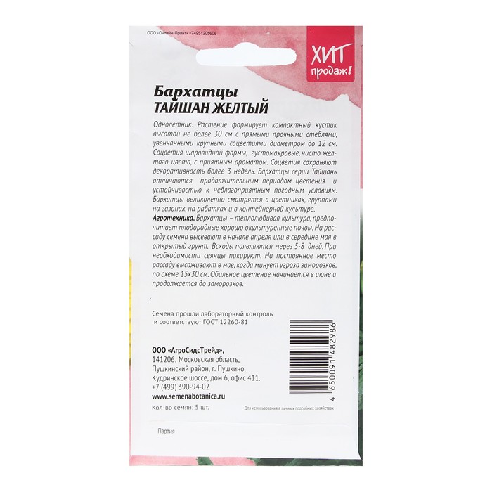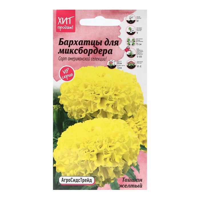 Семена Цветов Бархатцы «Тайшань желтый», 5 шт.
