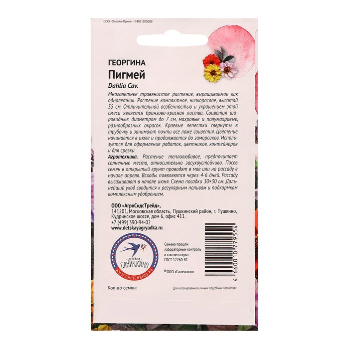 Семена цветов Георгина «Пигмей», смесь, 0.1 г, «Агросидстрейд»