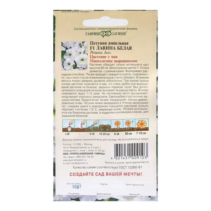 Семена цветов Петуния «Лавина», белая F1, ампельная, гранулы, пробирка, 7 шт., «Гавриш»