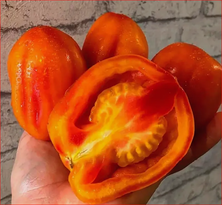 Необычные по форме плоды в виде нераскрывшегося бутона тюльпана. Растение среднеспелое, индетерминантное. Высота куста достигает 150 см в открытом грунте, в теплице около 180 см. Рекомендуется формировать в 2-3 ствола с обязательным пасынкованием и подвязкой. Оранжевые плоды с розовыми румянами внутри и снаружи . Гармоничный вкус со сладким послевкусьем. Мякоть плотная, ароматная, стенки толстые. Используется для свежего потребления, салатов, фарширования, консервирования, приготовления соусов. Масса плодов достигает 150-250 г.