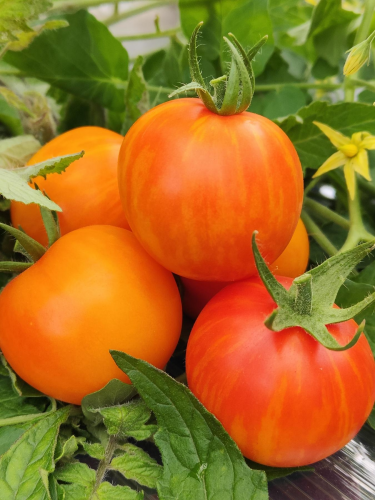 Индетерминант, до 2 м. Среднеспелый. Помидоры округлые и плоские, масса 20-30 грамм. На желтом фоне розовые и красные разливы, очень сладкие. Плотные, трещиноустойчивые. Отличный сорт для красивой баночной консервации.