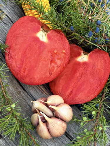 Крупноплодный, высокоурожайный сорт с красивыми плодами ярко-красной расцветки. Плоды все очень крупные, массой 500-700 гр , слегка ребристые , не подвержены растрескиванию. В разрезе мясистые, сочные, вкус гармоничный, хорошо сбалансированный Крепкие растения с прочными стеблями, плодоношение длительное. Сорт среднего срока созревания