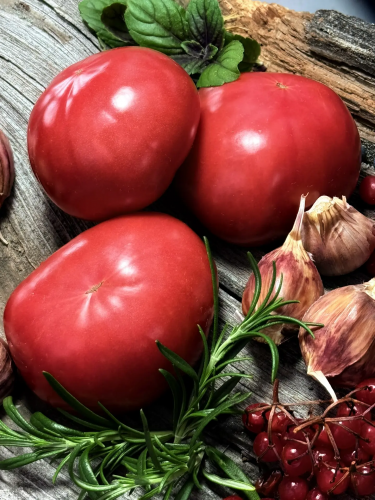 Индет. Среднеспелый. Помидоры плоскокруглой формы, розовые, массой 300-500 и до 800 грамм. Одно помидорное мясо. Вкус мягкий и сладкий. Для салатов, соусов, соков. Для получения крупных помидоров оставляйте в кисти не более 3 завязей.