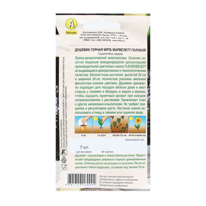 Пряно-ароматический многолетник. Отмечен золотой медалью международной организацией производителей цветочных семян FLEUROSELECT за выдающиеся декоративные и технологические качества. Компактные растения, высотой 20 см и шириной 30 см, полностью усыпаны мелкими фиолетово-синими цветами. Душевик прекрасно подходит для посадок вблизи дома и мест отдыха, у скамеек и беседок, в кашпо и вазоны, чтобы ощущать приятный аромат при каждом соприкосновении с растением. Привлекает пчел и других насекомых-опылителей. Не требует прищипки и регуляторов роста. Растение можно использовать в пищу в свежем или сушеном виде. Душевик – выносливое и зимостойкое растение. Предпочитает плодородные, влажные и хорошо дренированные почвы. Отлично растет на солнце и в полутени. После отцветания стебли подрезают, оставляя над землей 10 см.
