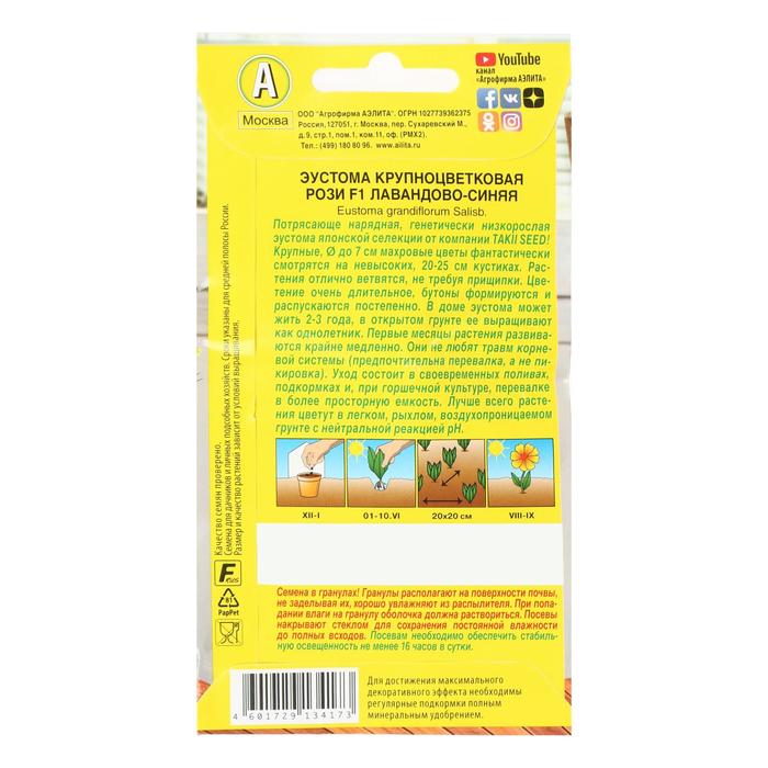 Потрясающе нарядная генетически низкорослая эустома японской селекции! Крупные, до 7 см в диаметре, махровые цветы фантастически смотрятся на невысоких, 20-25 см кустиках. Растения отлично ветвятся, не требуя прищипки. Цветение очень длительное, бутоны формируются и распускаются постепенно. В доме эустома может жить 2-3 года, в открытом грунте её выращивают как однолетник. Первые месяцы растения развиваются крайне медленно. Они не любят травм корневой системы (предпочительна перевалка,а не пикировка). Уход состоит в своевременных поливах, подкормках и, при горшечной культуре, перевалке в более просторную ёмкость. Лучше всего растения цветут в лёгком, рыхлом, воздухопроницаемом грунте с нейтральной реакцией pH.
