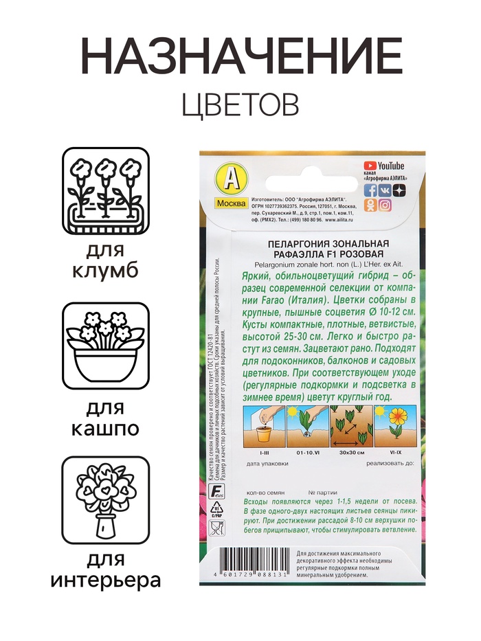 Новые гибриды пеларгонии Рафаэлла F1 розовая – образец современной селекции. Их красивые, компактные кусты высотой 30 см хорошо разветвлены, выглядят сильными, густыми, плотными. Венчающие куст пышные шары соцветий 12 см диаметром имеют богатую палитру цветов. Гибриды легко и быстро растут из семян – всходы появляются через 1-1,5 недели, зацветают на ранней стадии развития. Применение универсальное:горшечное содержание в комнатах, на солнечных балконах и в качестве летника в садовых цветниках. Растения устойчивы к жаре, хорошо переносят кратковременные понижения температуры. При соответствующем уходе (регулярные подкормки и подсветка в зимнее время) цветут круглый год.