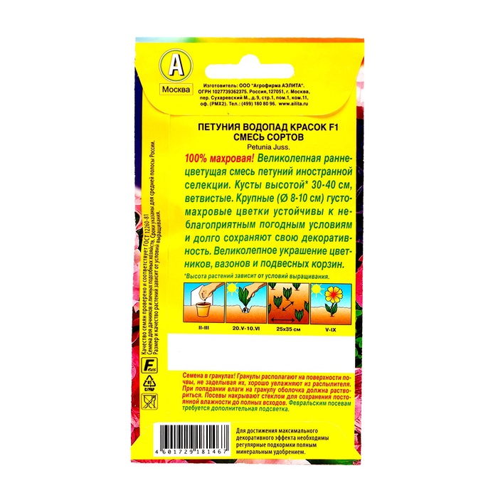 100% махровая. Петуния «Водопад красок» одна из самых ранних в цветении среди махровых петуний, с прекрасными характеристиками роста, великолепным ветвлением и обильным, длительным цветением. Крупные (10-13 см в диаметре) густомахровые цветки очень устойчивы к неблагоприятным погодным условиям, долго сохраняют свою декоративность и будут великолепным украшением цветников, вазонов и подвесных корзин.