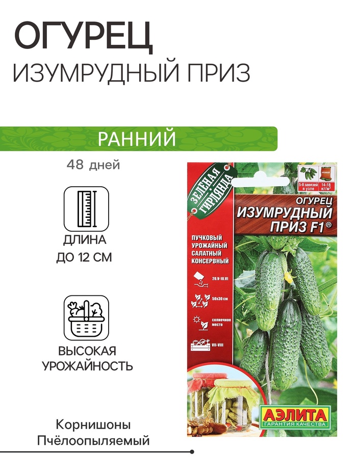 Партенокарпический гибрид для о/г и пленочных укрытий. Среднеспелый, от всходов до плодоношения 50-55 дней. Заложение завязей пучковое – по 5-8 в каждом узле. Зеленцы крупнобугорчатые, белошипые, массой 80-90 г. Вкусовые качества превосходные. Использование универсальное. Гибрид устойчив к кладоспориозу. Урожайность под пленкой 14-18 кг/м2 .