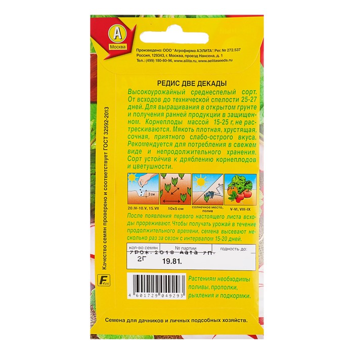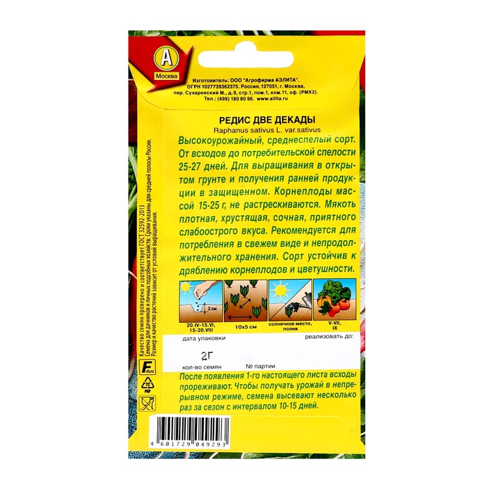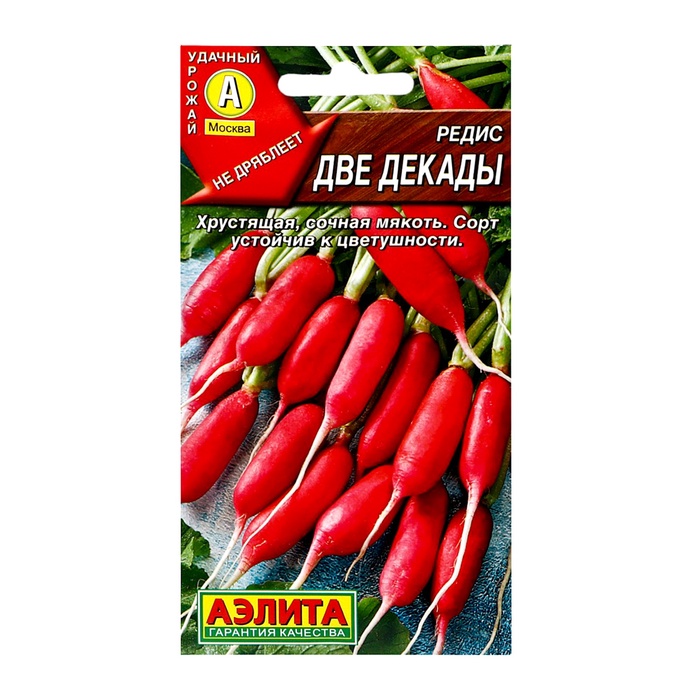 Высокоурожайный среднеспелый сорт, период от всходов до технической спелости 25-27 дней. Предназначен для выращивания в открытом грунте и получения ранней продукции в защищенном. Корнеплоды короткоовальные, выравненные, массой 15-25 г, не растрескиваются. Мякоть плотная, хрустящая, сочная, приятного слабо-острого вкуса. Рекомендуется для потребления в свежем виде и непродолжительного хранения. Сорт устойчив к дряблению корнеплодов и цветушности.