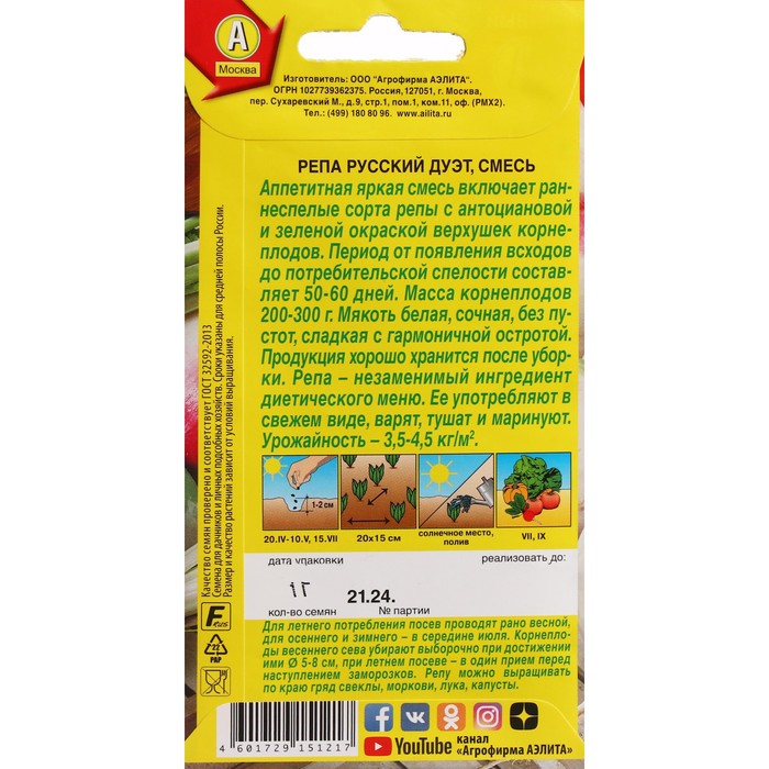 Аппетитная яркая смесь включает раннеспелые сорта репы с антоциановой и зеленой окраской верхушек корне плодов. Период от появления всходов до потребительской спелости составляет 50-60 дней. Масса корнеплодов 200-300 г.Мякоть белая, сочная, без пустот, сладкая с гармоничной остротой. Продукция хорошо хранится после уборки. Репа – незаменимый ингредиент диетического меню. Ее употребляют в свежем виде, варят, тушат и маринуют.Урожайность – 3,5-4,5 кг/м2.Для летнего потребления посев проводят рано весной, для осеннего и зимнего – в середине июля. Корнеплоды весеннего сева убирают выборочно при достижении ими 5-8 см, при летнем посеве – в один прием перед наступлением заморозков. Репу можно выращивать по краю гряд свеклы, моркови, лука, капусты.