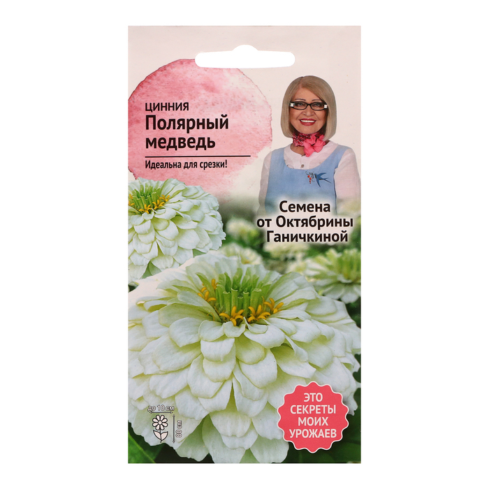 Однолетник. Растения высотой 80 см с крупными махровыми соцветиями диаметром до 10 см, окраска белая с зеленоватым оттенком. Циннию используют для посадки на сборные цветники, рабатки, клумбы и на срез для букетов. Агротехника: Растения светолюбивые, теплолюбивые и засухоустойчивые, не переносят заморозки. Семена высевают на рассаду в апреле или в открытый грунт в конце мая. Всходы появляются через 4 - 6 дней. В грунт рассаду высаживают в начале июня по схеме 20x30 см. Цветение наступает через 60-70 дней после появления всходов и продолжается до заморозков.рих-код - 4660010770513