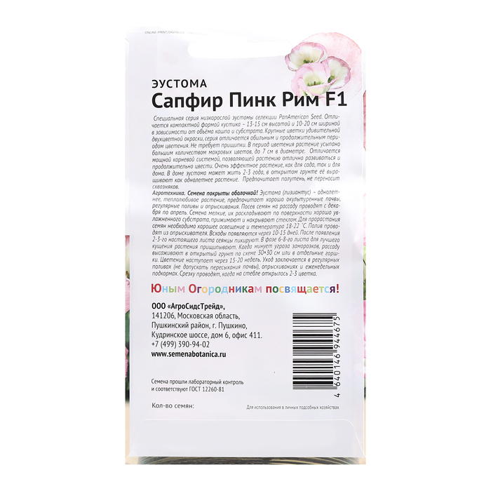 Специальная серия низкорослой эустомы селекции PanAmerican Seed. Отличается компактной формой кустика – 13-15см высотой и 10-20см шириной в зависимости от объёма кашпо и субстрата. Крупные цветки удивительной двухцветной окраски, серия отличается обильным и продолжительным периодом цветения. Не требует прищипки. В период цветения растение усыпано большим количеством махровых цветов, до 7см в диаметре. Отличается мощной корневой системой, позволяющей растению отлично развиваться и продолжительно цвести. Очень эффектное растение, как для сада, так и для дома. В доме эустома может жить 2-3 года, в открытом грунте её выращивают как однолетнее растение. Предпочитает полутень, не переносит сквозняков. Агротехника: Семена покрыты оболочкой! Эустома (лизиантус) – однолетнее, теплолюбивое растение, предпочитает хорошо окультуренные почвы, регулярные поливы и опрыскивания. Посев семян на рассаду проводят с декабря по апрель. Семена мелкие, их раскладывают по поверхности хорошо увлажненного субстрата, прижимают и накрывают стеклом. Для прорастания семян необходимо хорошее освещение и температура 18-22˚С. Полив проводят из опрыскивателя. Всходы появляются через 10-15 дней. После появления 2-3-го настоящего листа сеянцы пикируют. В фазе 6-8 листа для лучшего кущения растения прищипывают. Когда минует угроза заморозков, рассаду высаживают в открытый грунт по схеме 30×30 см или в отдельные горшки. Цветение наступает через 15-20 недель. Уход заключается в регулярных поливах (не допускать пересыхания почвы), опрыскиваниях и еженедельных подкормах. Срезку проводят, когда на стебле открылось 2-3 цветка.рихкод -