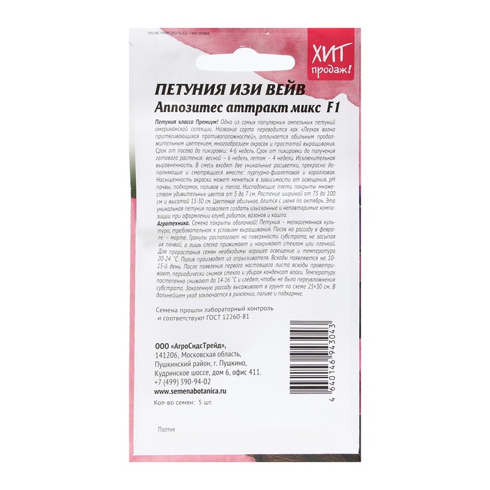 Одна из самых популярных ампельных петуний американской селекции. Название сорта переводится, как «легкая волна притягивающихся противоположностей», отличается обильным, продолжительным цветением, многообразием окрасок и простотой выращивания. Срок от посева до пикировки: 4-6 недель. Срок от пикировки до получения готового растения: весной - 6 недель, летом - 4 недели. Исключительная выравненность.