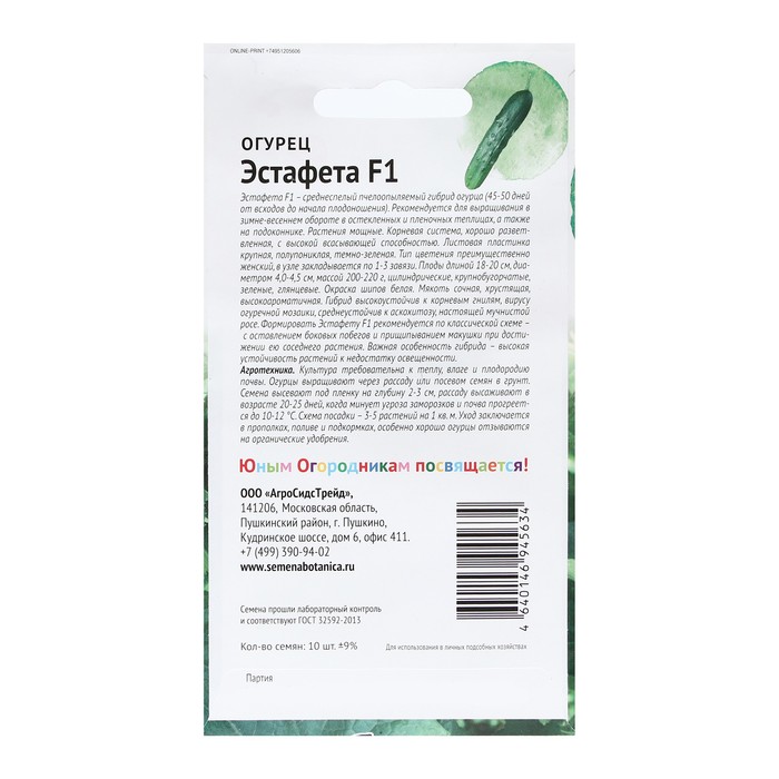Пчелоопыляемый гибрид для зимне-весеннего и продленного оборотов; для грунтов и малообъемки. Плоды, длиной 18-20 см, цилиндрические, с небольшим сбегом или плавной «ручкой», темно-зеленые со светлыми полосками до 1/3 длины плода, белошипые.