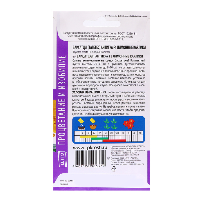 Самые величественные среди бархатцев. Компактный кустик высотой 25-30 см с крупными густомахровыми лимонными соцветиями (до 8-10 см) не оставит равнодушным любителей бархатцев. Многочис-ленные прочные цветоносы насыщенно зеленого цвета все лето до самых морозов покрыты яркими цветками. Растение наиболее устойчиво к неблагоприятным погодным условиям. Используется для цветников, бордюров, клумб. Прекрасно сочетается с сальвией и пеларгонией. Условия выращивания: посев март-апрель на рассаду, в мае возможен высев в открытый грунт в районах с теплым климатом. Рассаду высаживают после угрозы весенних заморозков. Растения, выращенные через рассаду, зацветают раньше и дольше цветут. Не требовательны к почве и влаге. Предпочитают открытые солнечные места. Чтобы продлить цветение необходимо удалять увядшие цветки.