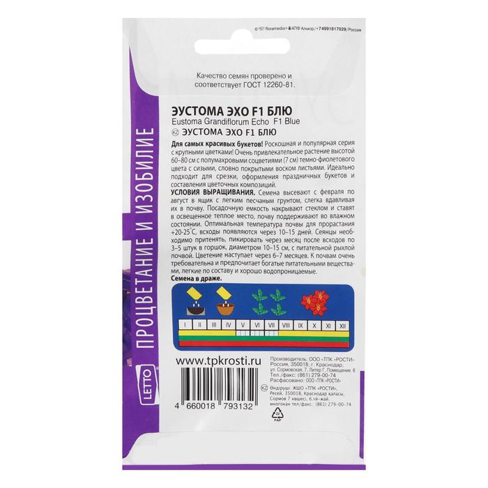 Однолетник Eustoma Grandiflorum Echo F1 Blue для самых красивых букетов. Роскошная и популярная серия с крупными цветками. Очень привлекательное растение высотой 60-80 см с полумахровыми соцветиями (7 см) темно-фиолетового цвета с сизыми, словно покрытыми воском листьями. Идеально подходит для срезки, оформления праздничных букетов и составления цветочных композиций.