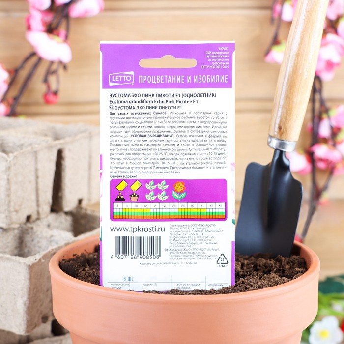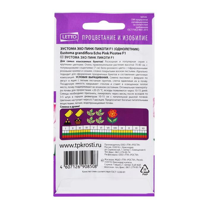 Эустома Пинк Пикоти F1 - раннецветущий гибридный сорт из серии “Эхо”. Растение отличается крупно-махровыми бутонами, кремовой окраской с нежно-розовой каймой. Хорошо смотрится культура среди групповых композиций на клумбе, рабатках, в вазоне, подходит для срезки в букеты.