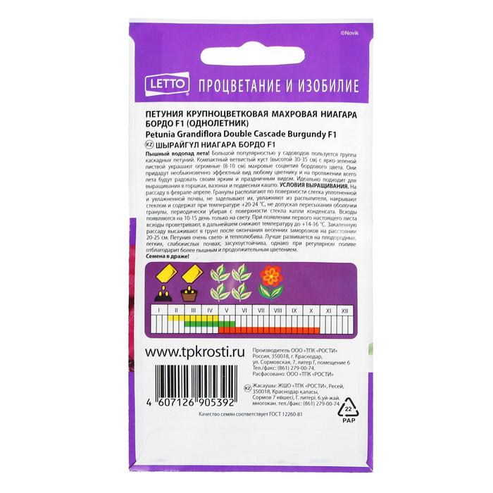 Компактный, ветвистый куст (высотой 30-35 см) с ярко-зеленой листвой украшают огромные (8-10 см) махровые соцветия бордового цвета. Они придадут необыкновенно эффектный вид любому цветнику, и на протяжении всего лета будут радовать своим ярким и праздничным видом. Идеально подходит для выращивания в горшках, вазонах и подвесных кашпо. Особенности выращивания: На рассаду февраль-апрель. Гранулы располагают по поверхности слегка уплотненной и увлажненной почвы, не заделывая их, увлажняют из распылителя, накрывают стеклом и содержат при температуре 20-24°С, не допуская пересыхания оболочки гранулы периодически убирая с поверхности стекла капли конденсата. Всходы появляются на 10-15 день только на свету. При появлении первого настоящего листа всходы проветривают и в дальнейшем снижают температуру до 14-16°С. Закаленную рассаду высаживают в грунт после окончания весенних заморозков на расстоянии 15-20 см. Петуния очень светолюбива и теплолюбива. Лучше развивается на плодородных, легких, слабокислых почвах, засухоустойчива, однако при регулярном поливе отблагодарит более пышным и продолжительным цветением.