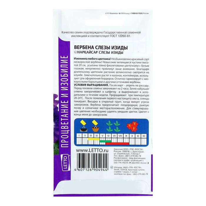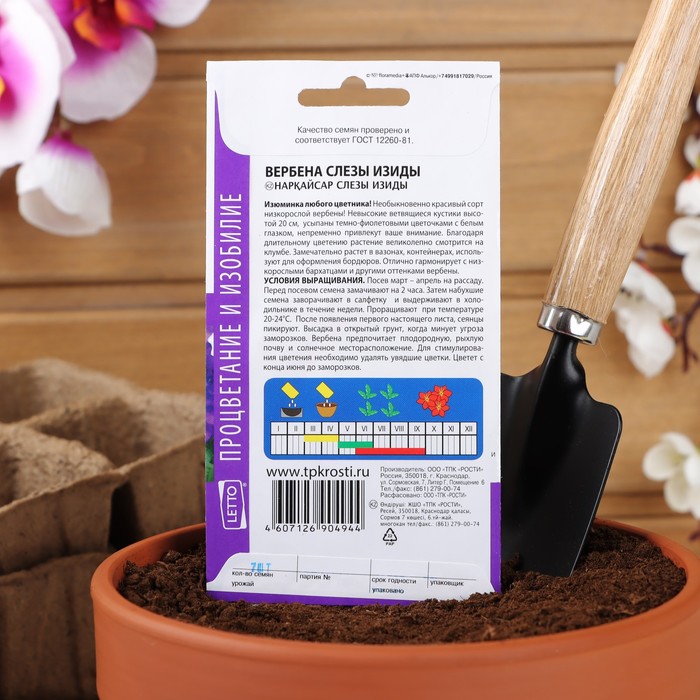 Условия выращивания: Посев март – апрель на рассаду. Перед Посевом семена замачивают на 2 часа. Затем набухшие семена заворачивают в салфетку и выдерживают в холодильнике в течение недели. Проращивают при температуре 20-24°С. После появления первого настоящего листа, сеянцы пикируют. Высадка в открытый грунт, когда минует угроза заморозков. Вербена предпочитает плодородную, рыхлую почву и солнечное месторасположение. Для стимулирования цветения необходимо удалять увядшие цветки. Цветет с конца июня до заморозков.