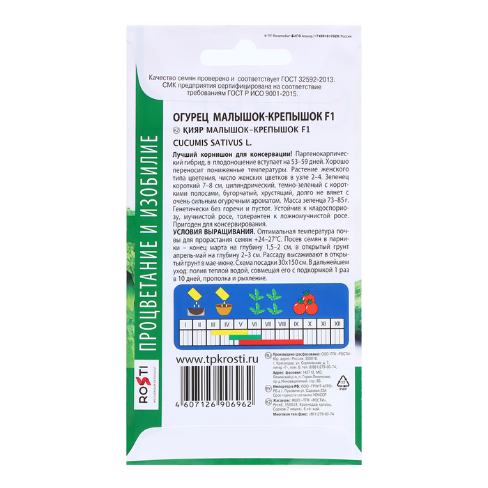 Лучший корнишон для консервации. Партенокарпический гибрид, в плодоношение вступает на 53-59 дней. Хорошо переносит пониженные температуры. Растение женского типа цветения, число женских цветков в узле 2-4. Зеленец короткий 7-8 см, цилиндрический, темно-зеленый с короткими полосами, бугорчатый, хрустящий, долго не вянет с очень сильным огуречным ароматом. Масса зеленца 73-85 г. Генетически без горечи и пустот. Устойчив к кладоспориозу, мучнистой росе, толерантен к ложномучнистой росе. Пригоден для консервирования. УСЛОВИЯ ВЫРАЩИВАНИЯ: оптимальная температура почвы для прорастания семян +24-27°С. Посев семян в парники - конец марта на глубину 1,5-2 см, в открытый грунт апрель-май на глубину 2-3 см. Рассаду высаживают в открытый грунт в мае-июне. Схема посадки 30x150см. В дальнейшем уход: полив теплой водой, совмещая его с подкормкой 1 раз в 10 дней, прополка и рыхление.