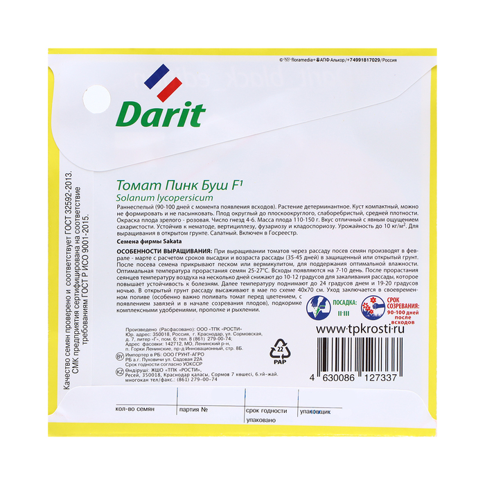 Включен в Госреестр по Северо-Кавказскому (6) региону для выращивания в открытом грунте. Салатный. Гибрид раннеспелый. Растение детерминантное. Лист среднего размера, темно-зеленый. Соцветие простое. Плодоножка с сочленением. Плод округлый до плоскоокруглого, слаборебристый, средней плотности. Окраска незрелого плода светло-зеленая, зрелого - розовая. Число гнезд 4-6. Масса плода 110-150 г. Вкус отличный. Содержание сухого вещества в соке 6,0-6,4%, общего сахара 3,4-3,5%. Урожайность товарных плодов 227-480 ц/га, на 7-45 ц/га выше стандартов Дар Заволжья и Агата, за первые два сбора - 80-183 ц/га, у стандартов - 90-140 ц/га. Выход товарных плодов до 95%. Устойчив к нематоде, вертициллезу, фузариозу и кладоспориозу.
