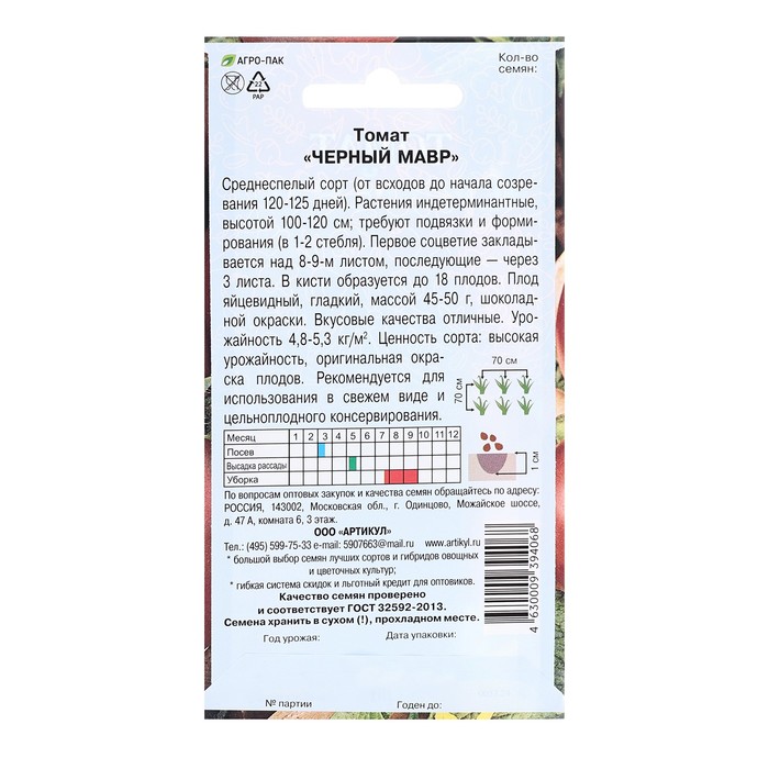 Среднеспелый сорт (от всходов до начала созревания 120-125 дней). Растения индетерминантные, высотой 100-120 см; требуют подвязки и формирования (в 1-2 стебля). Первое соцветие закладывается над 8-9-м листом, последующие - через 3 листа. В кисти образуется до 18 плодов. Плод яйцевидный, гладкий, массой 45-50 г, шоколадной окраски. Вкусовые качества отличные. Урожайность 4,8-5,3 кг/м2.